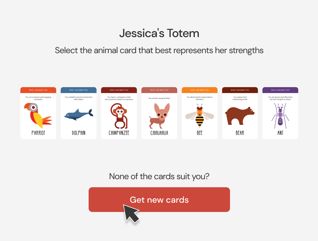 Our Totem cards are designed to strengthen caring relationships with positive statements that encourage players to speak from their heart. With Totem Participation Credits, access 160 Animal and Quality cards and inspire your colleagues to express what they appreciate about each other.